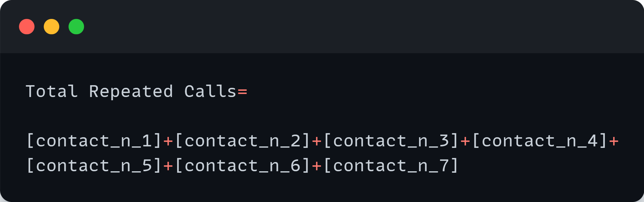 Generate calculated fields such as "Total repeated calls" by aggregating 'contact_n_#' columns.